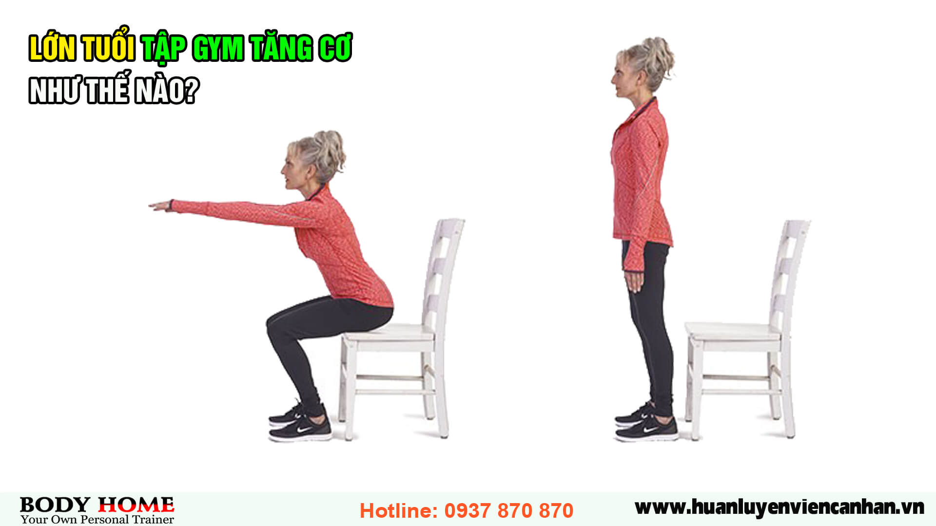Squat với ghế là bài tập nền tảng giúp tăng cơ đùi, mông và hỗ trợ khả năng đứng lên ngồi xuống, rất cần thiết trong sinh hoạt hằng ngày của người lớn tuổi.
